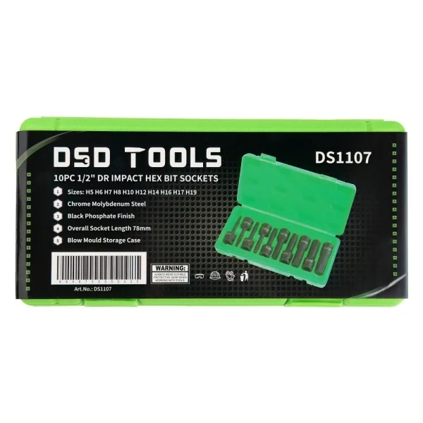 Set de 10 chei tubulare hexagonale de impact cu acționare de 1/2″. Dimensiuni: H5, H6, H7, H8, H10, H12, H14, H16, H17 și H19 • CR-MO • Finisaj fosfatat • Acționare de 1/2″ • Furnizat în cutie de depozitare • Lungime 78 mm