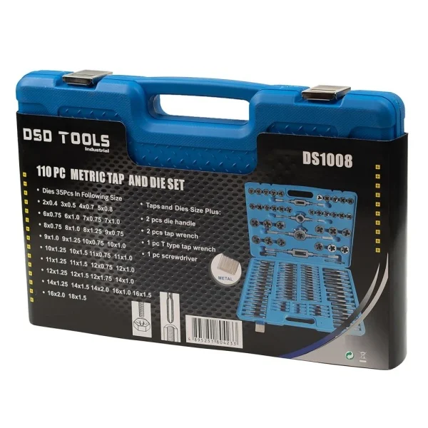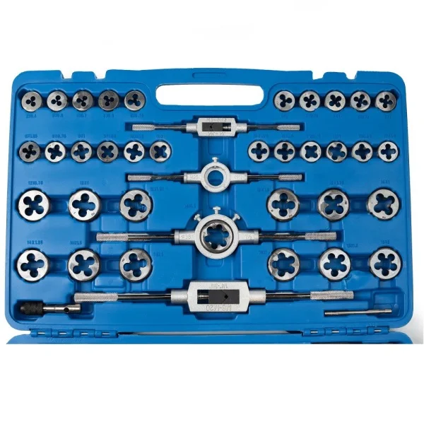 35 de conuri, 35 de tarozuri și 35 de filiere, 35 în următoarele dimensiuni: 2×0,4, 3×0,5, 4×0,7, 5×0,8, 6×0,75, 6×1,0, 7×0,75, 7×1,0, 8×0,75, 8×10, 8×1,25, 9×0,75, 9×1,0, 9×1,25, 10×0,75, 10×1,0, 10×1,25, 10×1,5, 11×0,75, 11×1,0, 11×1,25, 11×1,5, 12×0,75, 12×1,0, 12×1,25, 12×1,5, 12×1,75, 14×1.0, 14 x 1.25, 14×1.5, 14×2.0, 16×1.0, 16×1.5, 16×2.0, 18×1.5 2 x Mâner filiere 2 x Cheie de tarod 1 x Cheie de tarod tip T