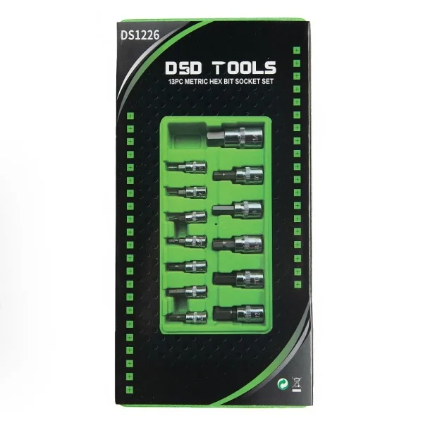 7 buc. – cheițe de antrenare 1/4″ (lungime: 37 mm) – 2, 2,5, 3, 4, 5, 5,5 și 6 mm 5 buc. – cheițe de antrenare 3/8″ (lungime: 48 mm) – 7, 8, 9, 10 și 12 mm 1 buc. – cheițe de antrenare 1/2″ (lungime: 55 mm) – 14 mm