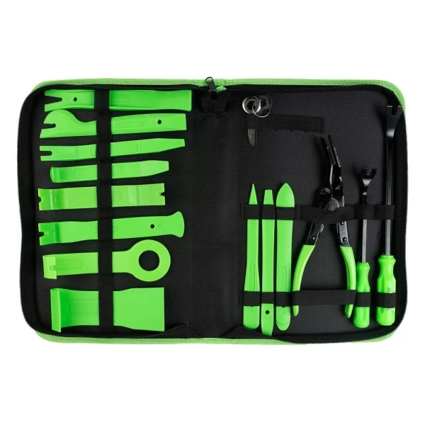 Acest kit conține unelte pentru a îndepărta cu ușurință garniturele, moldura, panourile ușilor și tablourile de bord, precum și unelte pentru demontarea echipamentelor audio și deblocarea terminalelor.