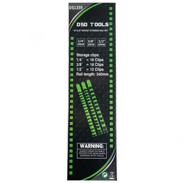 Un pachet de trei șine pentru depozitarea cheilor tubulare, clemele pentru chei tubulare au poziționări pe rulmenți cu bile pentru depozitare ușoară și sigură. Dimensiuni chei: 1/4″, 3/8″ și 1/2″ Cleme de depozitare: 1/4″ = 16 cleme, 3/8″ = 16 cleme și 1/2″ = 12 cleme, 44 în total Lungime șină: 340 mm