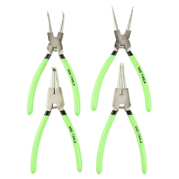 1 x Clește extern drept 1 x Clește intern drept 1 x Clește extern îndoit 1 x Clește intern îndoit Dimensiune: 225 mm Mânere negre și verzi cu găuri