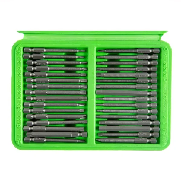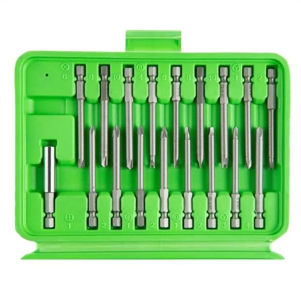 Biți stea: T8-10-15-20-25-27-30-35-40 Biți Torx anti-schimbare: T10-15-20-25-30 Biți cu ambreiaj: 1-2-3 Biți dinamometrice: 6-8-10 Biți caneluri: M5-6-8 Biți tri-aripioare: 1-2-3-4 Biți pătrate: 1-2 Biți pentru chei fixe: 4-6-8-10 mm Biți plate: 4-5-6 mm Biți Phillips: PH 1-2 Biți Pozidrive: PZ 1-2 Biți hexagonale anti-schimbare: 2-2.5-3-4-5-6 mm Biți hexagonale: 4-5-6 mm Suport magnetic pentru biți Biți CR-V