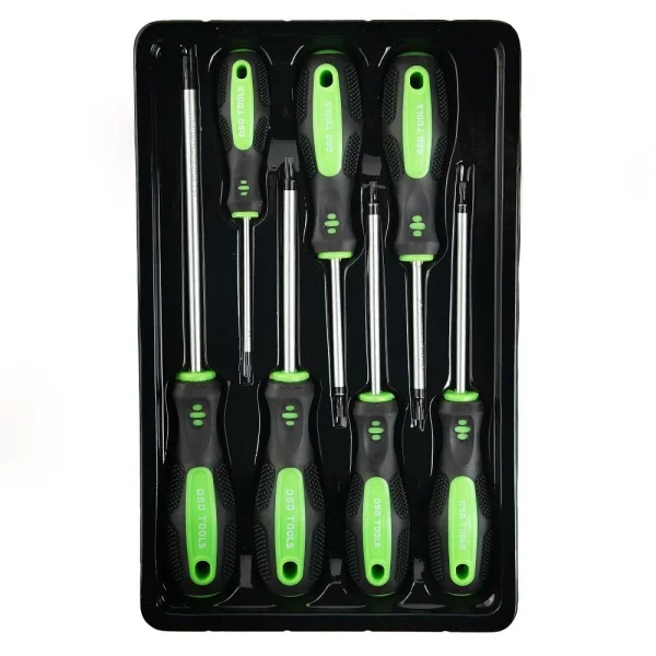 Set de șurubelnițe stea cu șapte piese Dimensiuni: T10x75mm, T15x75mm, T20x75mm, T15x100mm, T20x100mm, T25x100mm, T30x150mm • Lamă din oțel crom-vanadiu • Vârf magnetic negru • Mâner tip pernă