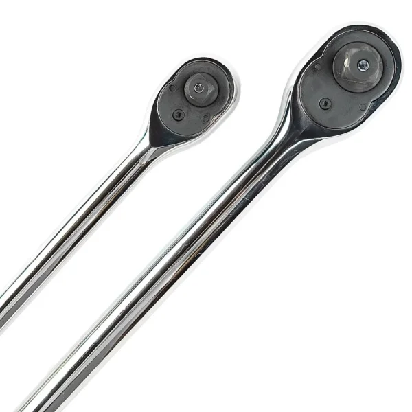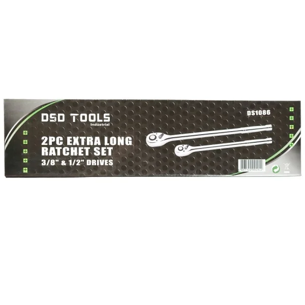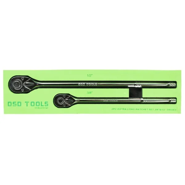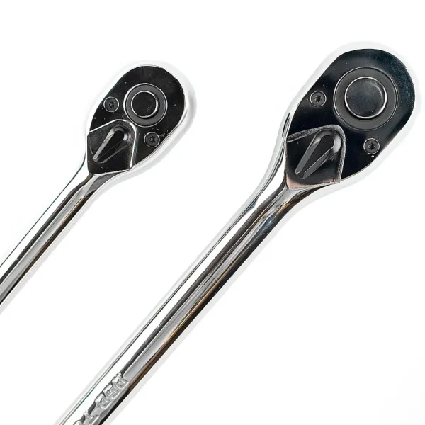 SET DE 2 CLICHETI EXTRA LUNGI CU ACȚIUNI DE 3/8″ ȘI 1/2″ Un set de 2 clicheti manuale extra lungi. • Acționare de 3/8″ și 1/2″ • Eliberare rapidă • Reversibile • Mecanism cu clichet cu 72 de dinți pentru rotație lină • Șurubelnița este fabricată din material CR-MO pentru rezistență • Corp fabricat din 40CR, cromat pentru protecție • Lungime acționare de 3/8″: 280 mm • Lungime acționare de 1/2″: 380 mm • Furnizate în tavă de depozitare EVA