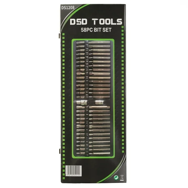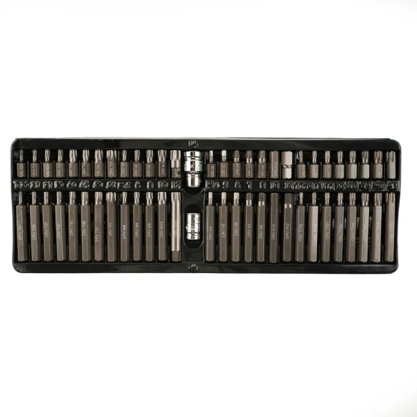 Set de 58 de biți, inclusiv o gamă completă de biți hexagonali, stea, stea de securitate și caneluri. Include și adaptoare