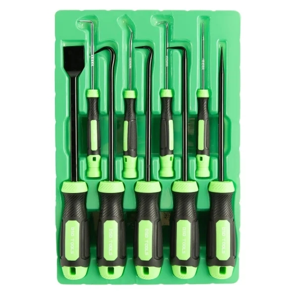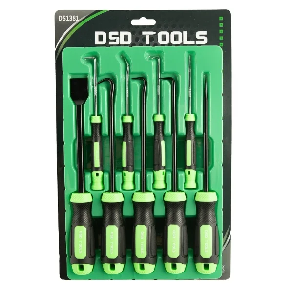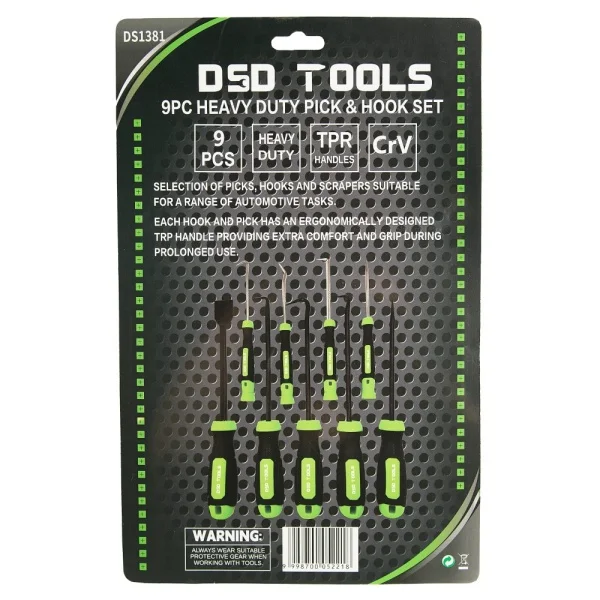 Patru carlige scurte cu tije din oțel zimțate, cu finisaj lustruit, și patru carlige lungi și o răzuitoare cu tije din oțel cu finisaj negru fosfatat. Potrivite pentru scoaterea ace/clemelor, îndepărtarea furtunurilor și răzuirea garniturilor. Cârligele mai mari sunt perfecte pentru îndepărtarea acelor țevi de apă imposibil de îndepărtat etc. Mânere TRP ergonomice pentru o prindere confortabilă. Specificații – 4 carlige scurte 165 mm, 4 carlige lungi 260 mm, Lungimi răzuitoare 165 mm și 260 mm, Mânere TRP, Finisaj din oțel crom-vanadiu lustruit pe tije mici, Finisaj din oțel fosfatat pe tije mari, Livrate în tavă de depozitare din plastic